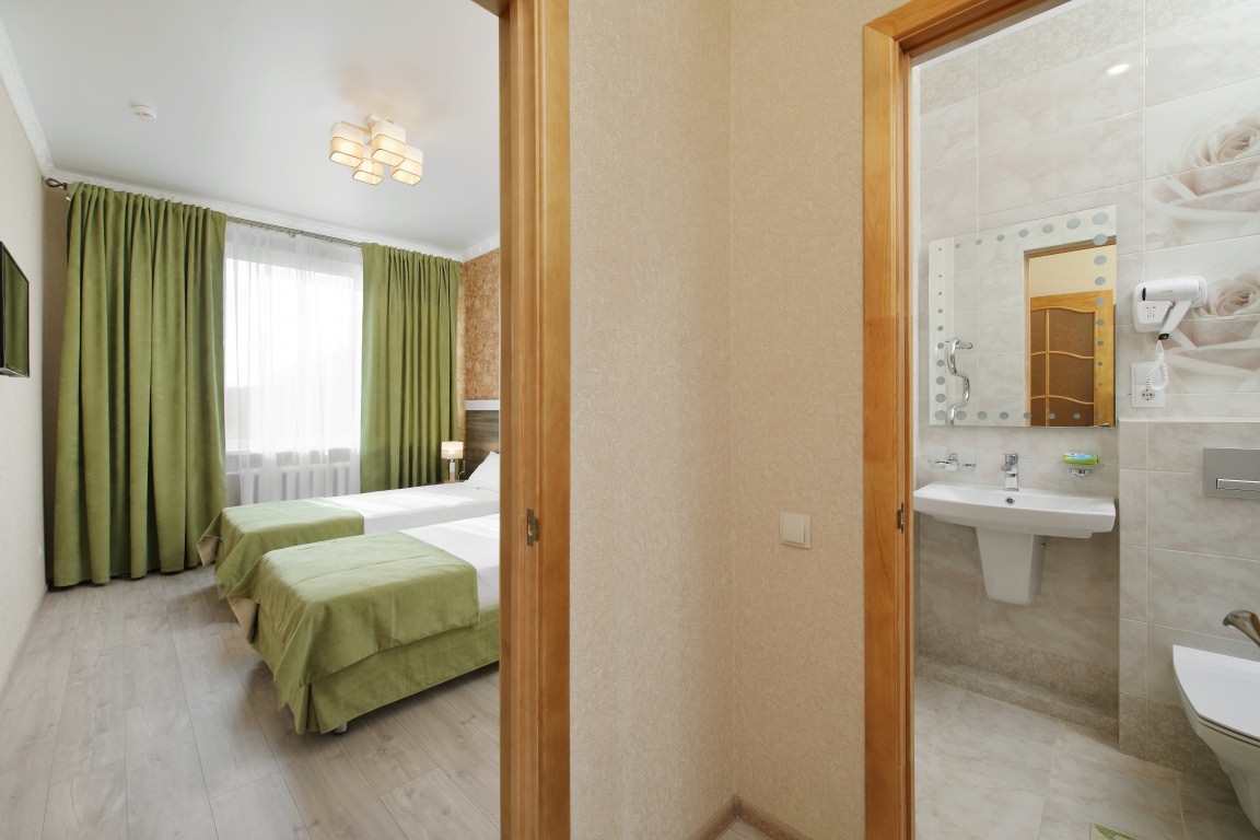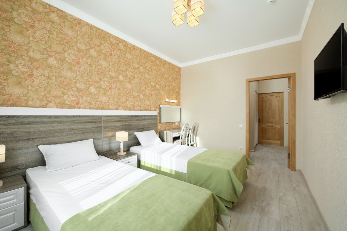 В номере две односпальные кровати, кресла, журнальный столик и посуда, которые послужат для комфорта гостей.